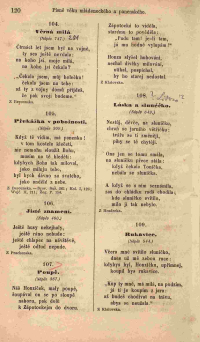 104. Věrná milá. (Nápěv 747.) Čtrnáct let jsem byl na vojně, ty ses ještě nevdala: na koho jsi, moje milá, na koho jsi čekala? „Čekala jsem, můj holečku! Čekala jsem na tebe: až ty z vojny domů přijdeš, že pak svoji budeme. Z Berounska. |