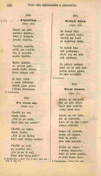 289. Fijalička. (Nápěv 582.) Sázela má milá modrou fíjaličku; když ji nasázela, prosila vlažičku. Vlažička nepřišla, přišla jen rosička, aby jí neuschla modrá fijalička. Modrá fijalička co pávové peří: každá holka blázen, která chlapci věří. Já taky věřila a jsem oklamána: ztratila jsem prsten s třema kamenama. Z Prachenska. |