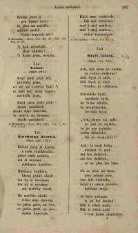 356. Dívčí žalost. (Nápěv 154, 722.) Ach, kýž jsem za vodou, za vodou studenou! dala bych si ulejt, dala bych si ulejt troubu, to stříbrnou. Zatroubila bych, zaplakala bych, na svého milého, na neupřímného, zavolala bych. „Ach, dcero má milá! co pak jsi myslila, že jsi pro jednoho hocha falešného tak se zarmoutila?“ Ach! té mojí lásky neuhasí ve mně ani ten deštíček, ani ten deštíček, co se přes les žene. Co se přes les žene, přes zelené pole, tam kde vorávalo, když za mnou chodilo, potěšení moje. Já byla upřímná, ty jsi byl falešný: Bůh ti štěstí nedá, Bůh ti štěstí nedá v tom jiném manželství. Bůh ti štěstí nedá na tom tvém statečku: že jsi mne oklamal, že jsi mne oklamal chudobnou děvečku! – Ty hvězdičko tmavá! kdybys slzy znala, a měla srdíčko, má zlatá hvězdičko, jiskry bys plakala! Plakala bys se mnou, plakala noc celou, že pro věno zlaté nevěsty bohaté s milým mne rozvedou. Z Berounska – Srov. Čel. II, 13, 14. |