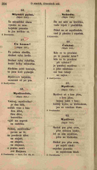 57. Co komu? (Nápěv 427.) Po potoce chodila, drobné ryby lovila. Drobné ryby rybářům, hezké holky mlynářům. Sládkům ještě hezčejší, to jsou hoši pyšnéjší. Myslivcovi lecjakás, ucouraná až po pás. Z Budějovicka. |