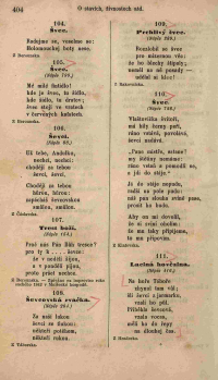 107. Trest boží. (Nápěv 154.) Proč nás Pán Bůh tresce? pro ty k… ševce: že v neděli šijou, a v pondělí pijou, proto pršet nechce. Z Berounska. – Zpíváno ex improviso roku suchého 1842 v Mníšecké hospodě. |