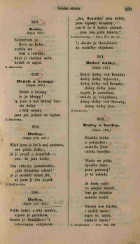 259. Dolky. (Nápěv 276, 341.) Když jsem já šel k mej panence, ona pekla dolky; já ji prosil o kousíček – ona: že jsou horky. Ona vždycky pomaloučku: „Jdi Honzíčku odtad!“ já jí nechtěl odtad jíti, až jsem jí dva popad. Z Budějovicka. |