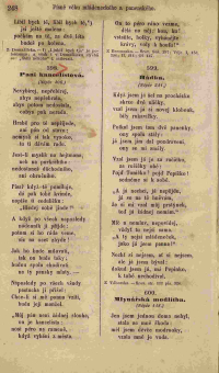 600. Mlynářská modlitba. (Nápěv 448.) Jen jsem jednou doma nebyl, stala se mně škoda: měl jsem děvče modrooký, vzala mně je voda. A já pudu do kláštera, budu prosit Boha, aby mně ho navrátila ta zpátečná voda. Z Hradecka. (Nápěv 285.) Když jsem nebyl doma, stala se mně škoda: měl jsem hezkou holku, krásnou holubinku, vzala mně ji voda! Ach vodo, vodičko! návrat mně mou milou: jest-li nenavrátíš, škody nenahradíš, namluvím si jinou. Šel jsem do kostela prosit pána Boha, aby mně mou milou, holku roztomilou, navrátila voda. Z kostela jsem přišel, mou milou jsem našel; a tak z toho smutku, těžkého zármutku byl jsem zase vesel. Z Hradecka. – Srov. Suš. 117. |