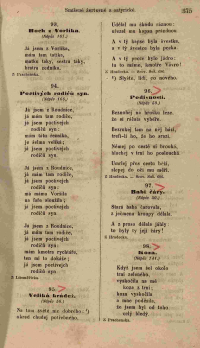 96. Podivnosti. (Nápěv 50.) Beznohej na hrušku leze, že si ráčata vybéře. Bezrukej tam na něj hází, trefí-li ho, že ho srazí. Němej po cestě si brouká, hluchej v trní ho poslouchá. Umrlej přes cestu běží, slepej do očí mu měří. Z Hradecka. – Srov. Suš. 686. |